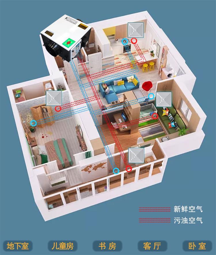 什么是雙向流新風系統呢?雙向流新風系統為強制排風、強制送風,一側用專用設備向室內送新風,再從另一側由專用設備向室外排出,在室內會形成"新風流動場",新風主機通過管道與室內的空氣分布器相連接,新風主機不斷的把室外新風通過管道送入室內,以滿足人們日常生活所需新鮮、有質量的空氣。排風口與新風口都帶有風量調節閥,通過主機的動力排與送來實現室內通風換氣。